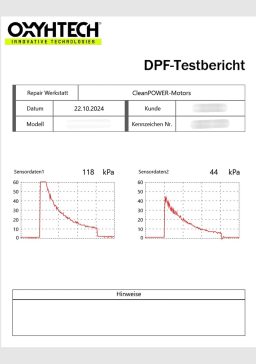Zudem führen unsere DPF Cleaner eine Differenzdruckmessung vor und nach der Reinigung durch, diese wird als Messprotokoll im Anschluss ausgehändigt.
